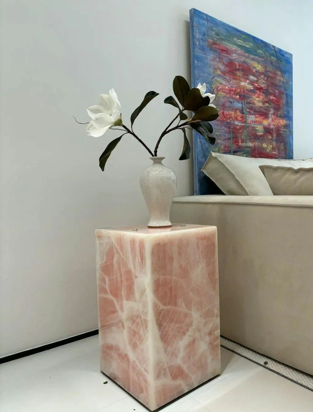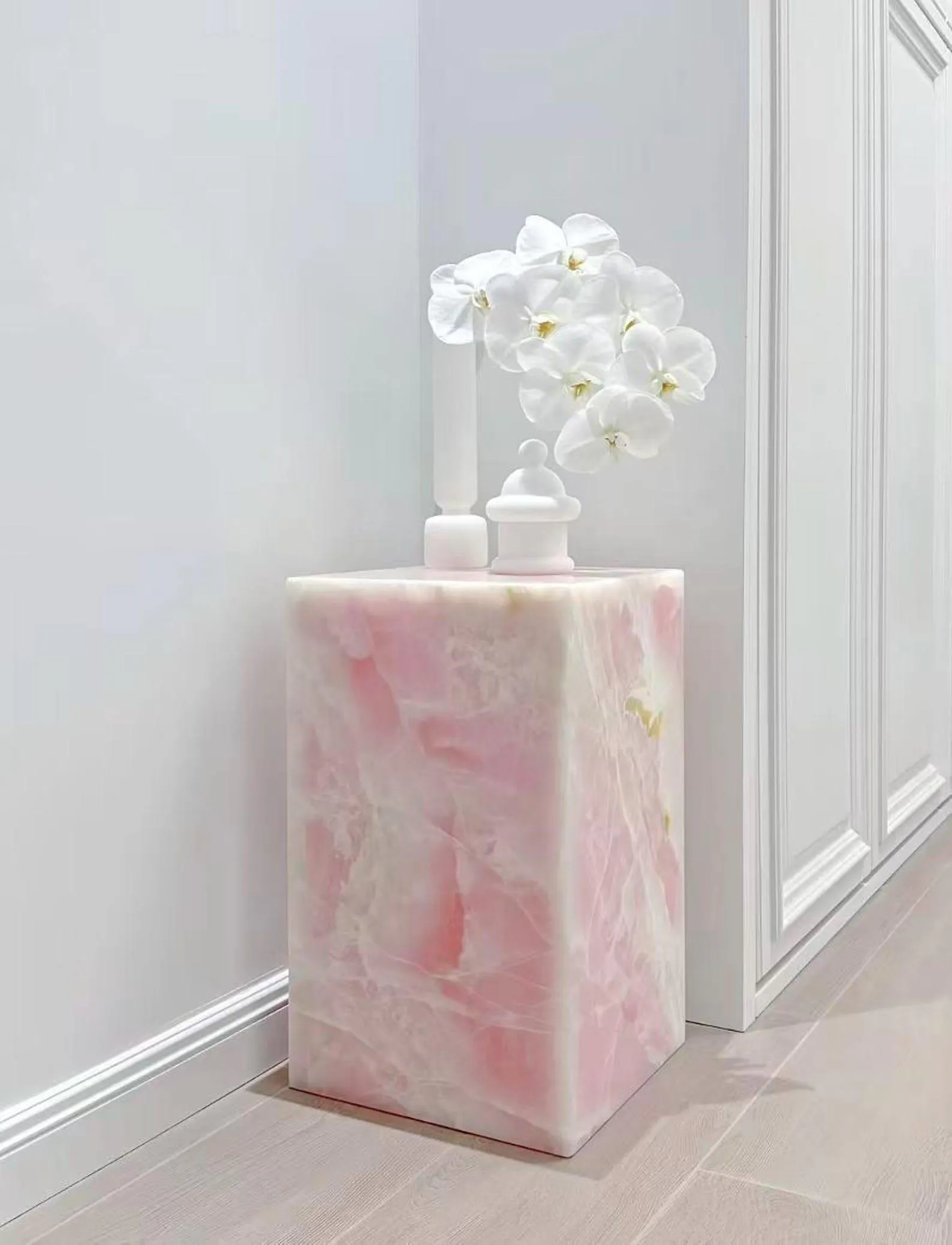 The Pink Onyx Plinth brings a warm, subtle presence into the home through natural stone marked by soft tonal variation and gentle translucency.